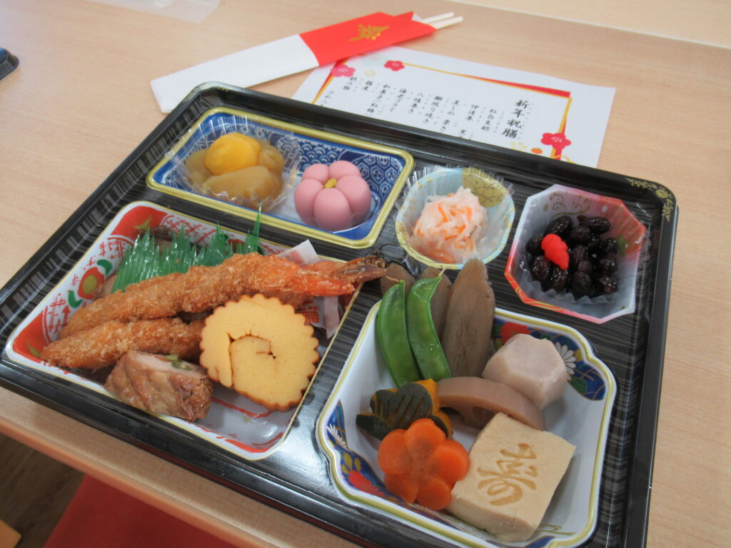 美山苑では、年末年始にかけて感染症の発症もなく穏やかな元日を迎えることができました。新年祝賀会では大勢の入居者と職員とで新年の祝いを行い、祝い膳とお雑煮を食し良いお正月を迎えることができました。